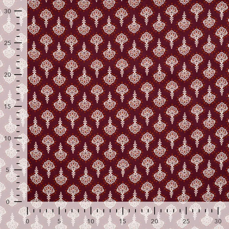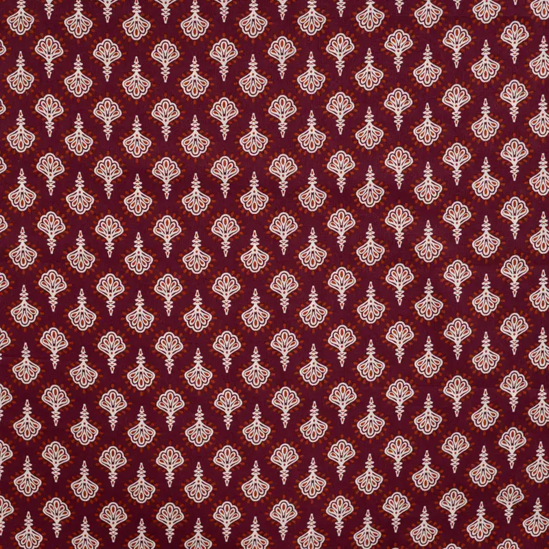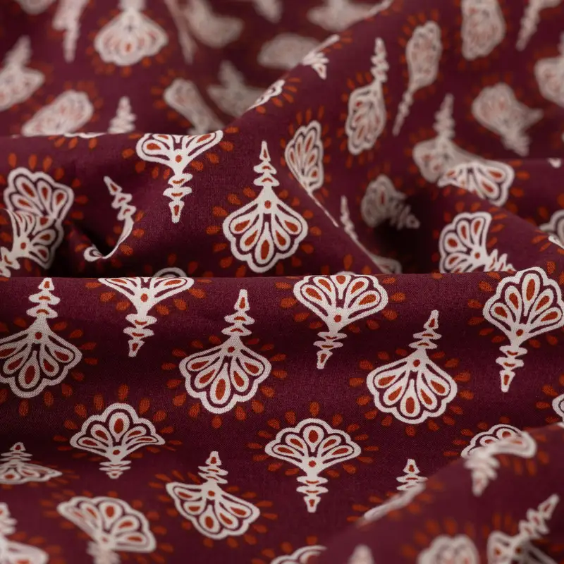 Das feine Retro-Motiv in warmem Cognac-Weinrot wirkt elegant und gleichzeitig verspielt – genau richtig für sommerliche Kleidung, die sich angenehm trägt und trotzdem besonders aussieht.