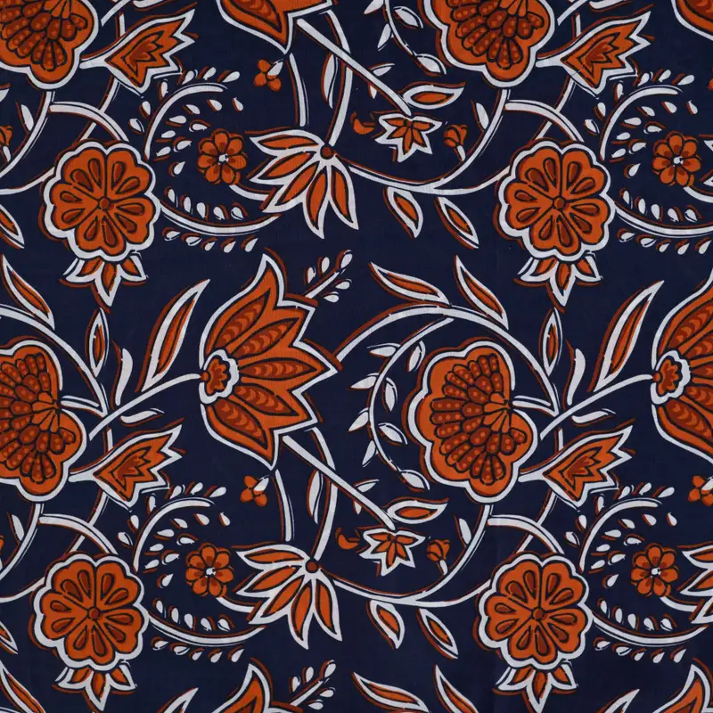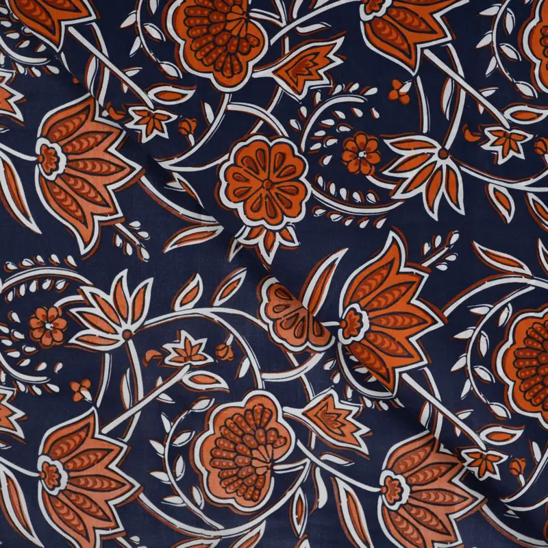 Der Baumwoll-Voile „Navy Floral“ ist ein ultraleichter, weich fallender Baumwollstoff mit ausdrucksstarkem floralem Ethno-Muster. Das tiefe Navyblau bildet einen stilvollen Kontrast zu den warmen Terracotta- und Weißtönen und verleiht dem Stoff eine moderne, elegante Wirkung – ideal für sommerliche Outfits, die ein bisschen mehr Charakter haben dürfen.