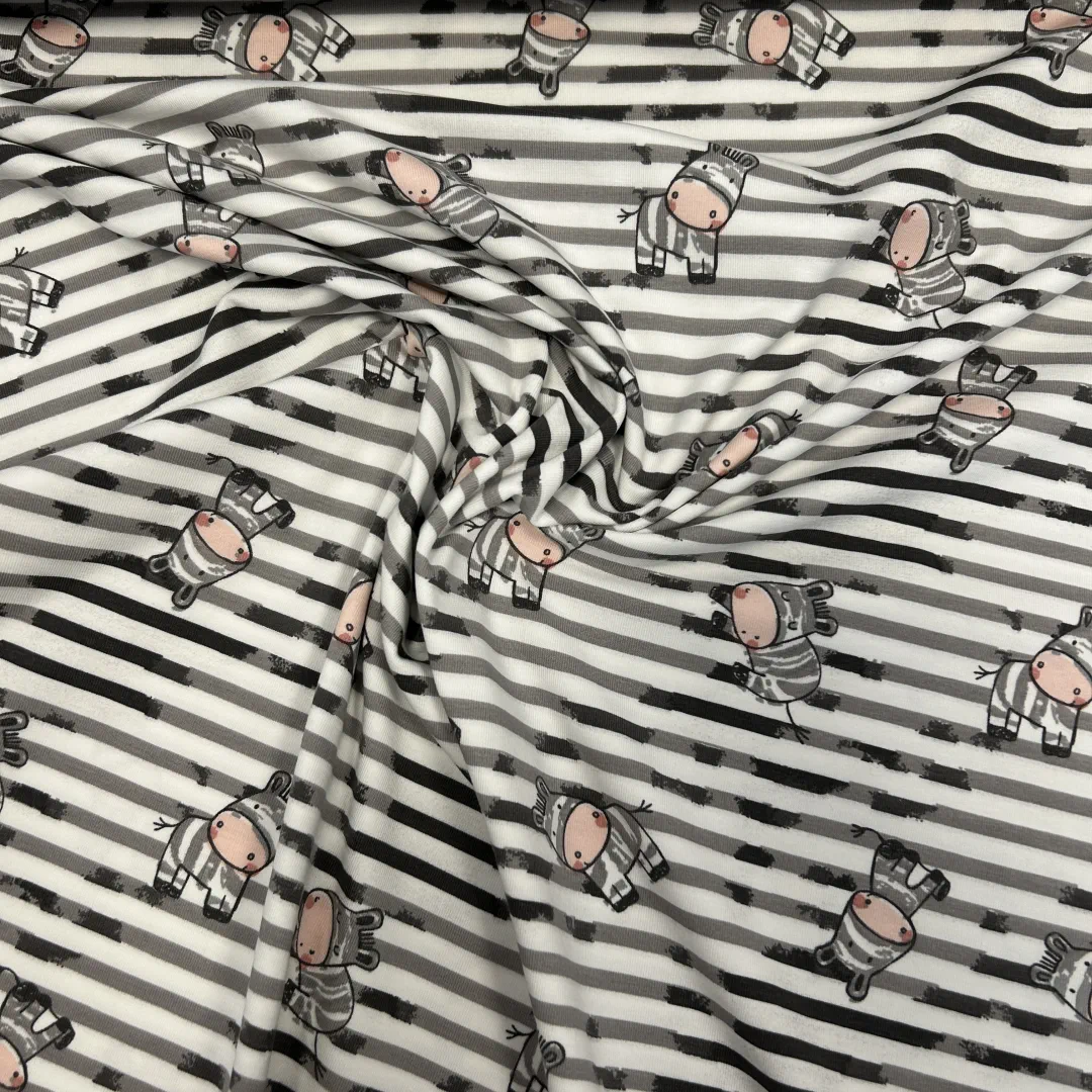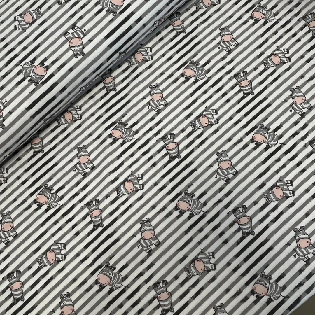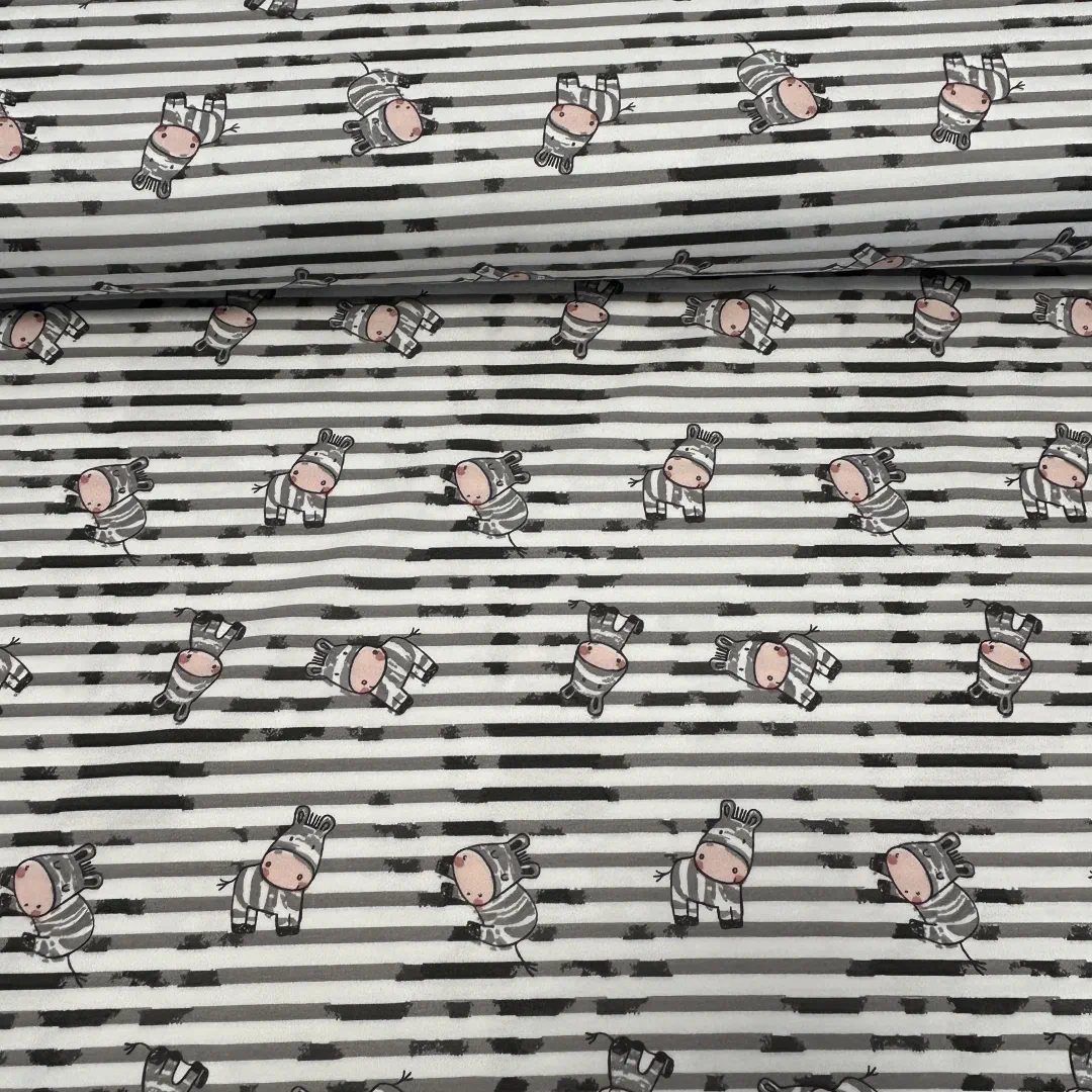 Der Baumwolljersey „Kleine Zebras – Grau/Weiß“ ist ein fröhlicher, moderner Kinderstoff, der sofort gute Laune verbreitet. Die kleinen Zebras in niedlichen Posen tanzen über die grau-weiß gestreifte Basis und geben dem Stoff eine verspielte, aber trotzdem ruhige Optik.