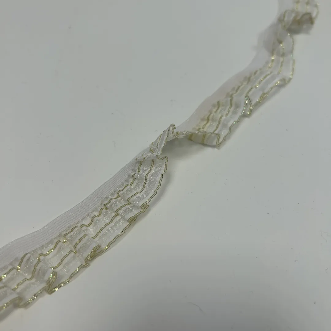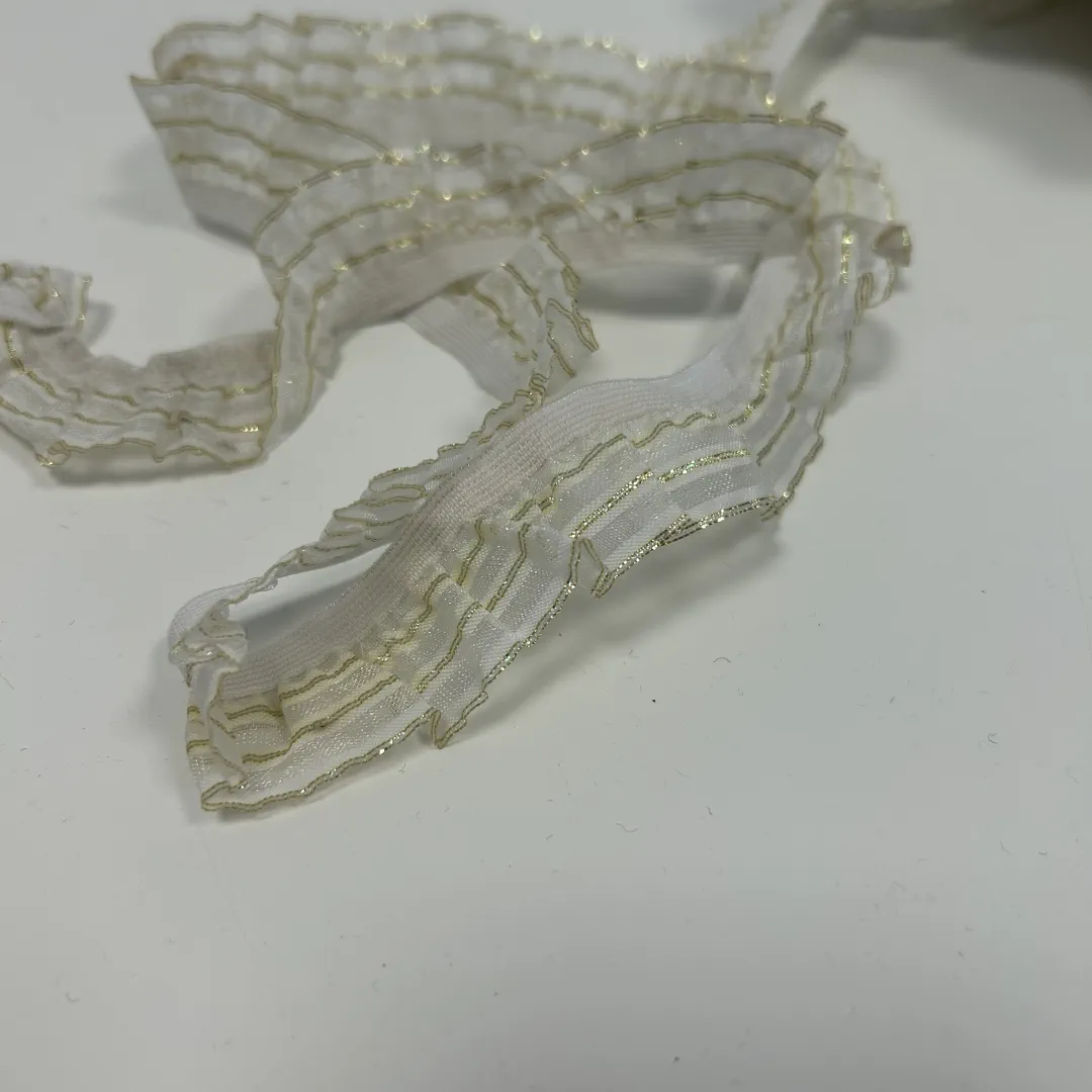 Elastisches Rüschband 20 mm – Weiß mit goldenen Akzenten