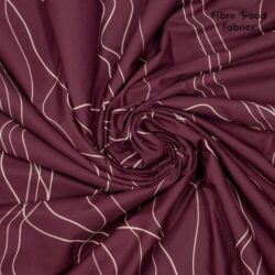Das Design zeigt ein grafisches Linienmuster auf tiefem Burgundy, das elegant und zugleich modern wirkt. Dieser Stoff eignet sich perfekt für schlichte, aber aussagekräftige Kleidungsstücke, die durch Schnitt und Muster wirken dürfen.