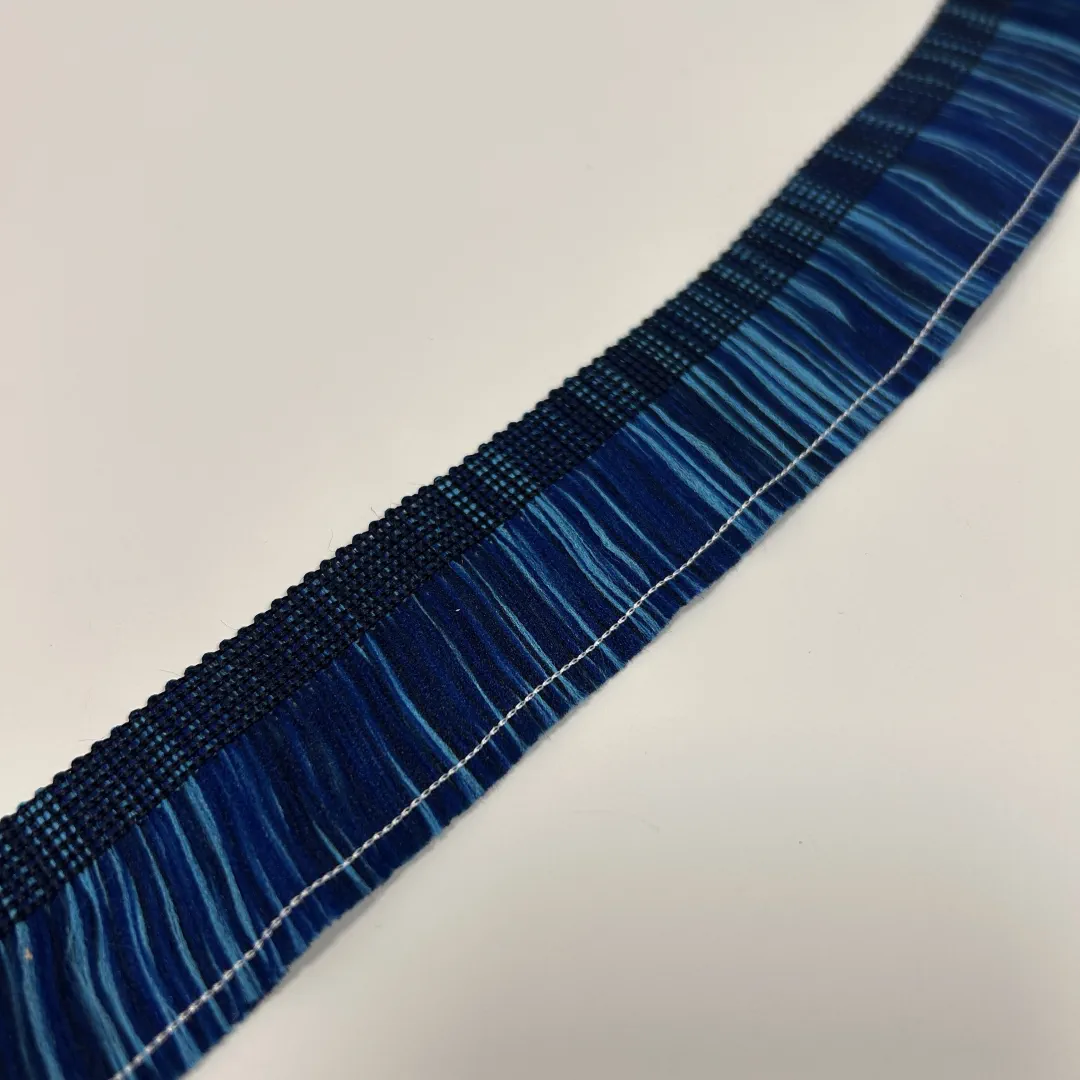 Die Fransenborte „Ocean Night“ kombiniert tiefes Marineblau mit lebhaften Aquastreifen und schafft so einen Look, der an nächtliche Meereswellen erinnert. Die dicht gearbeiteten, weich fallenden Fransen bringen Bewegung und Charakter in jedes Nähprojekt – ideal für Taschen, Kleidung, Boho-Deko oder besondere Akzente an Home-Accessoires.