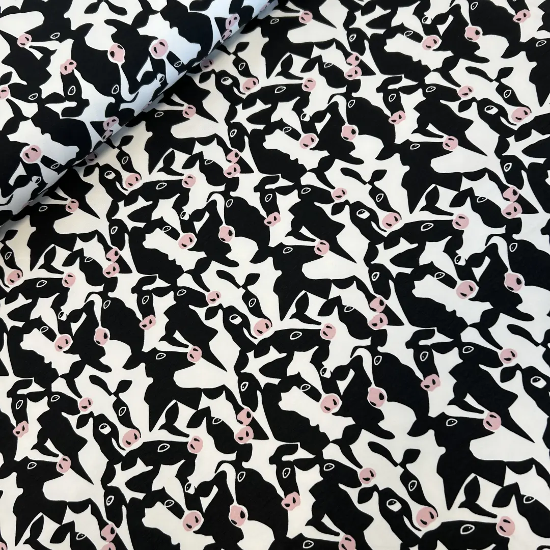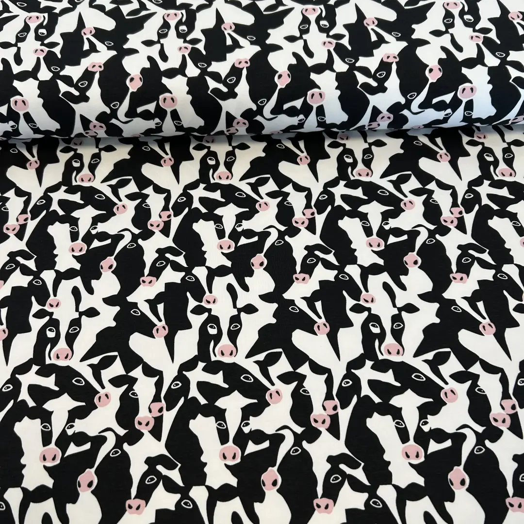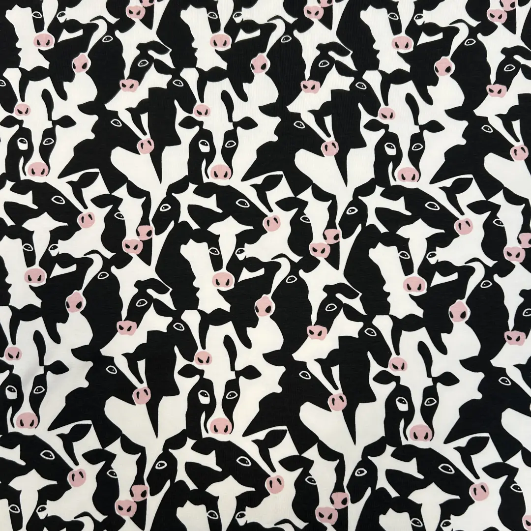 Muuuuh – dieser angeraute French Terry mit witzigem Kuhkopf-Print ist ein echtes Highlight für deine Nähprojekte! Die schwarz-weißen Kuhköpfe mit rosa Details bringen Spaß in deine Garderobe – perfekt für Jung und Alt.