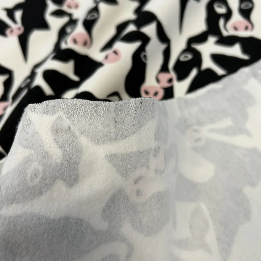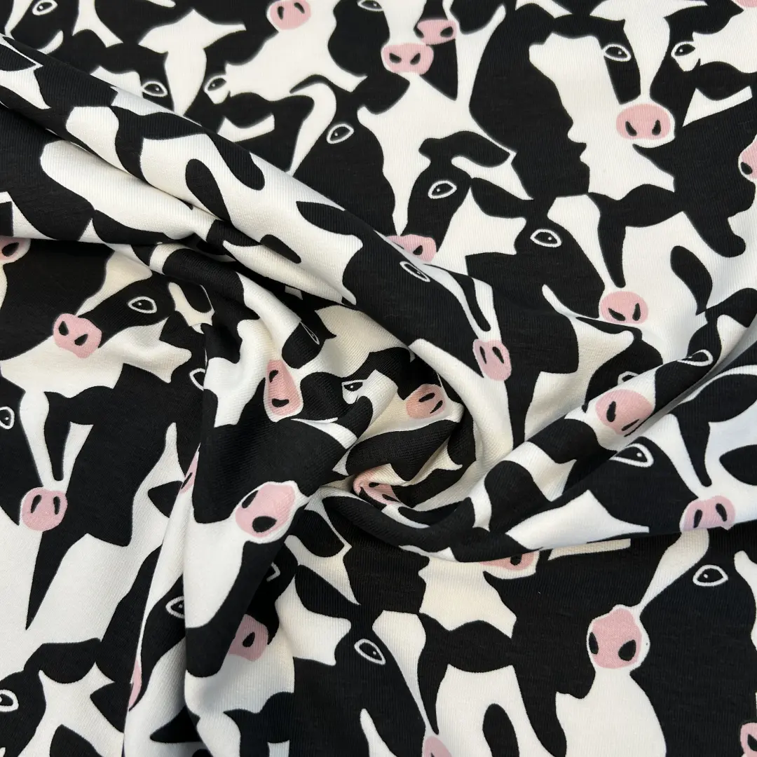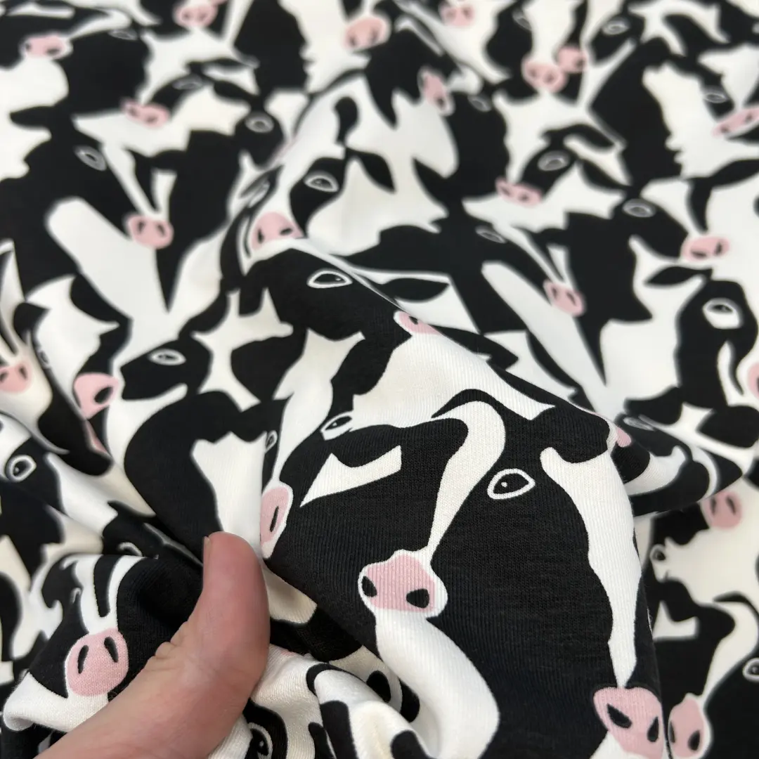 Muuuuh – dieser angeraute French Terry mit witzigem Kuhkopf-Print ist ein echtes Highlight für deine Nähprojekte! Die schwarz-weißen Kuhköpfe mit rosa Details bringen Spaß in deine Garderobe – perfekt für Jung und Alt.