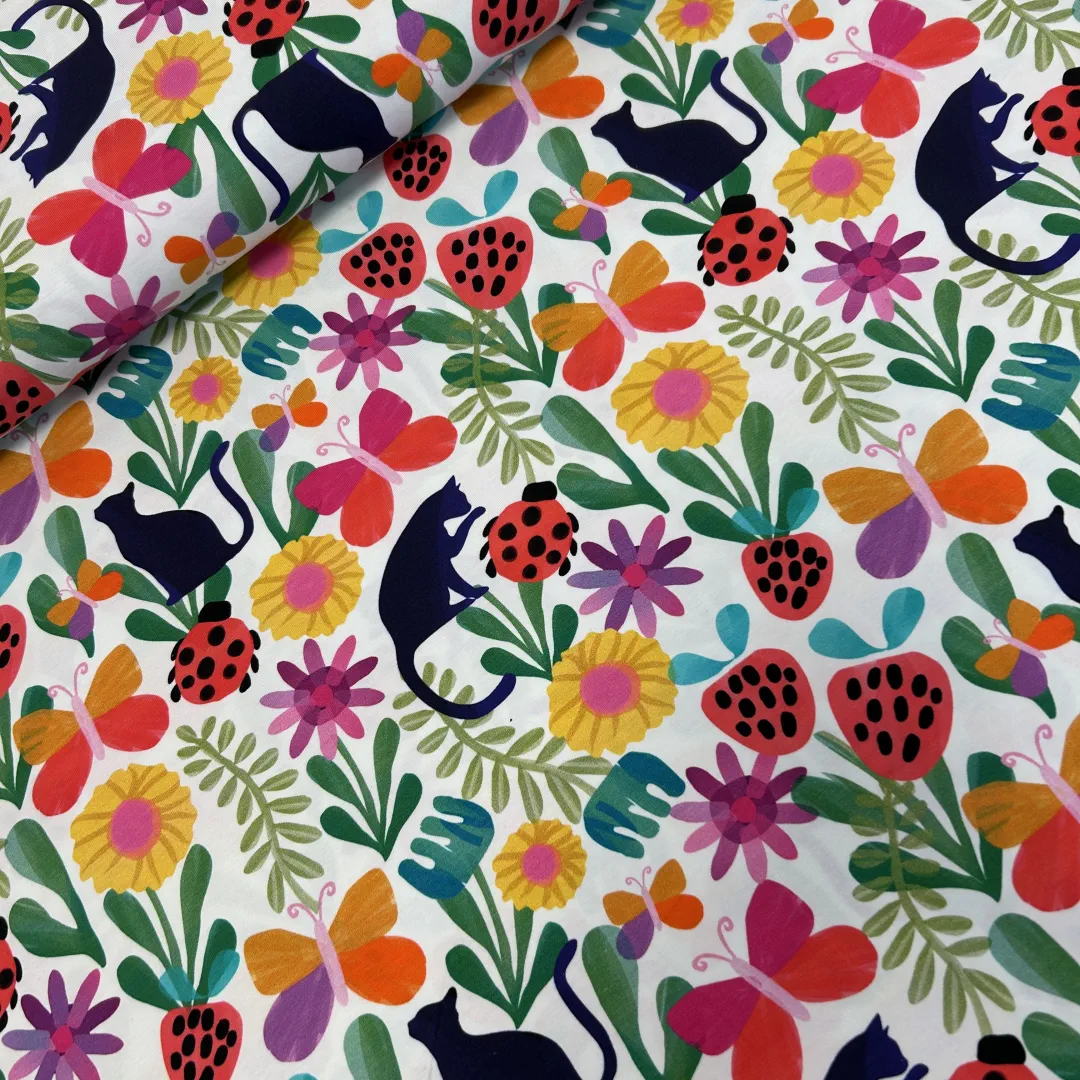 Jersey „Sommerwiese mit Katzenzauber“ – bunter Baumwolljersey mit Katzen, Blumen & Marienkäfern