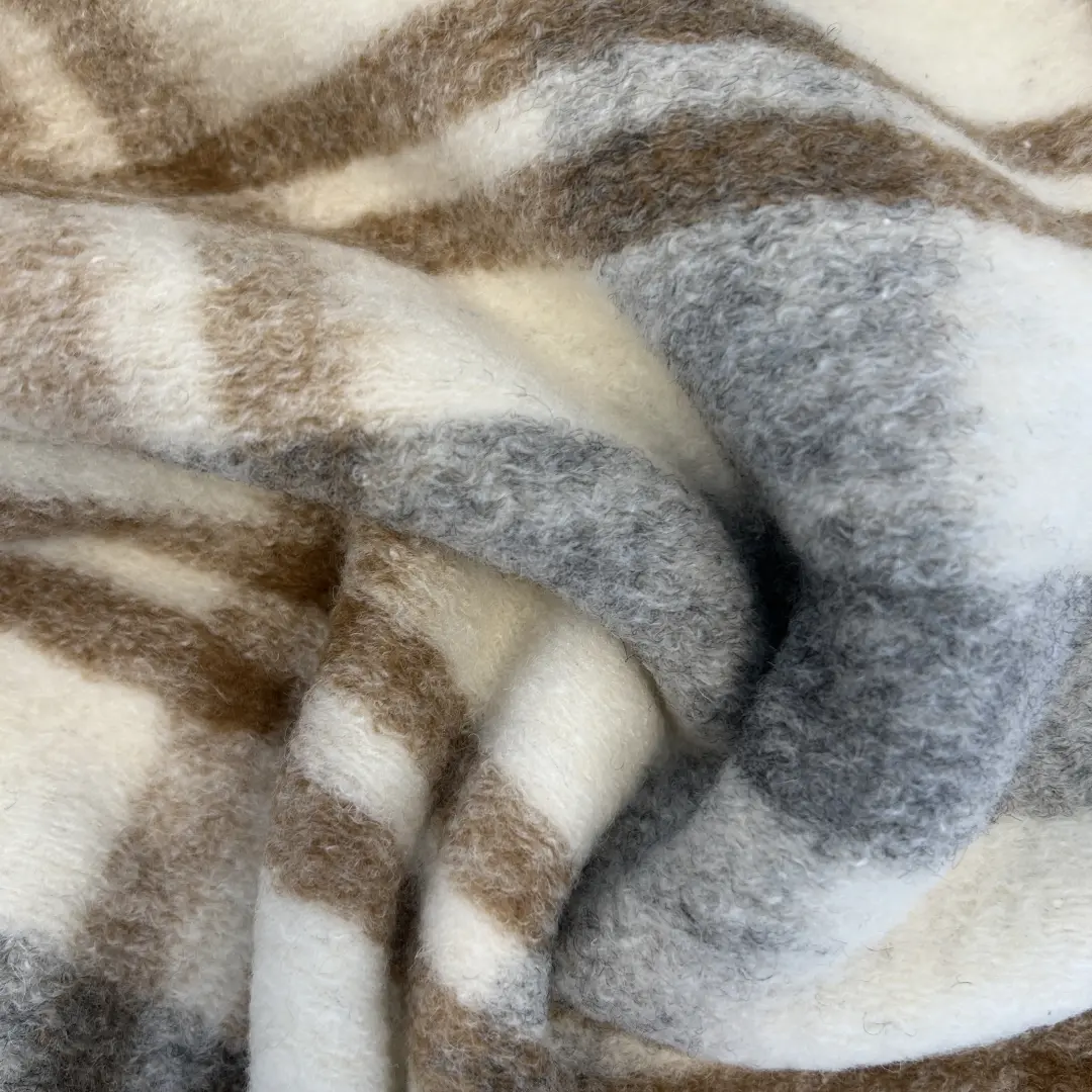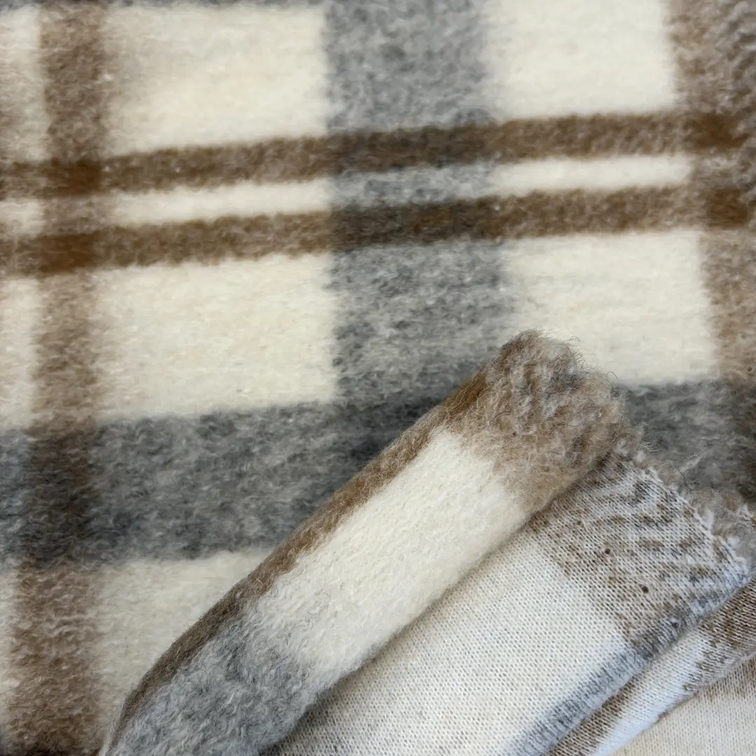Das klassische Karomuster in Grau, Braun und Creme macht den Stoff zeitlos und vielseitig kombinierbar – ideal für elegante Mäntel, Ponchos, Jacken oder Westen. Durch die Wollmischung hält er wunderbar warm und ist perfekt für die kühleren Monate.