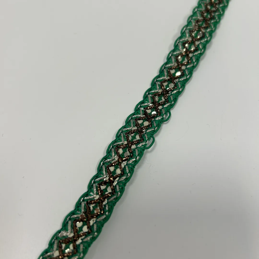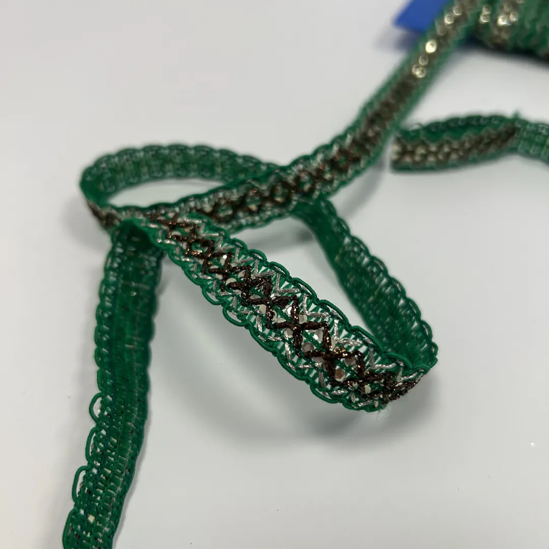 Diese elegante Posamentborte in Tannengrün mit kupfer-goldenem Lurexfaden ist die farbige Ergänzung zur „Snowflake Copper“. Das filigrane Muster wirkt edel, glitzert dezent und macht die Borte ideal für festliche, winterliche oder folkloristische Nähprojekte.