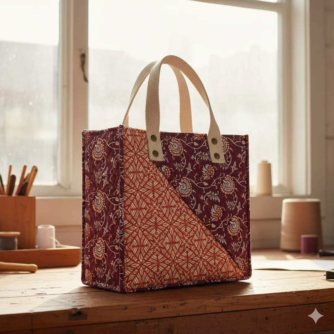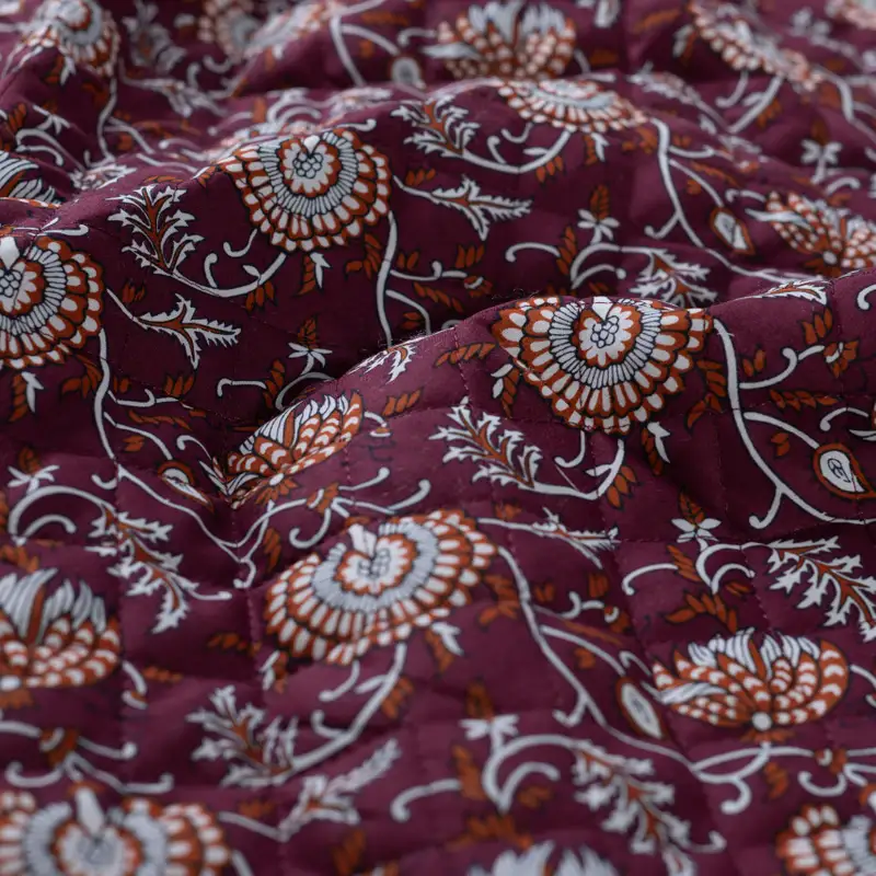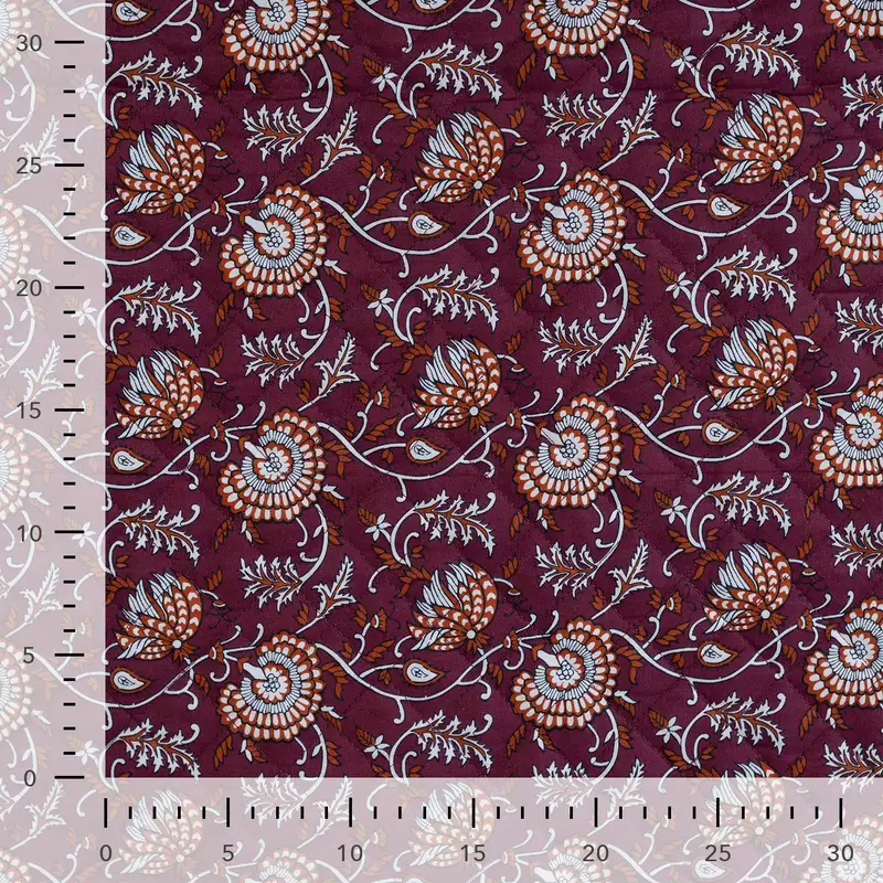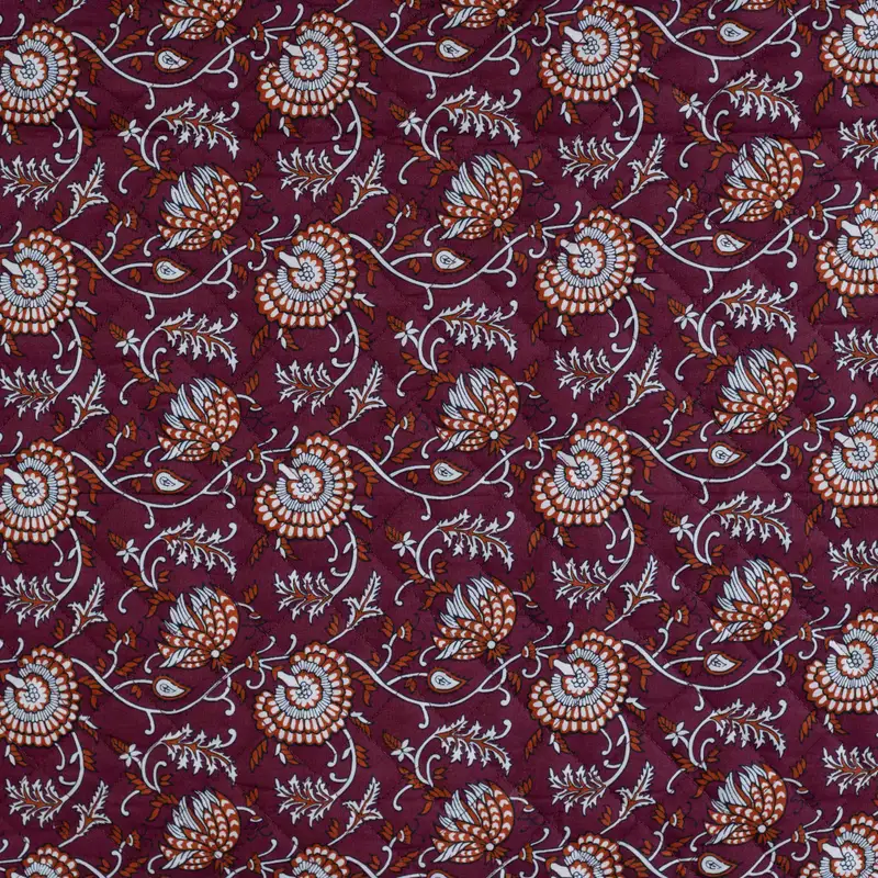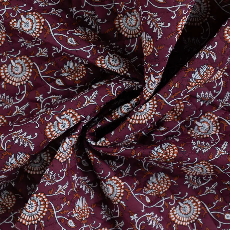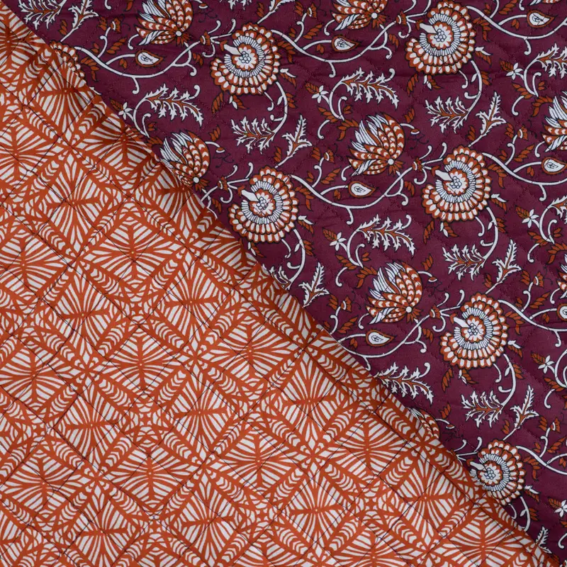 Eine warme, florale Seite in sattem Weinrot mit Ethno-Blüten – und eine geometrische Terracotta-Seite, die modern und klar wirkt. Durch die aufwendige Steppung bekommt der Stoff Struktur, leichte Polsterung und ein besonders wertiges Griffgefühl.