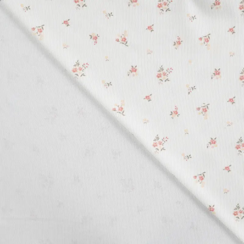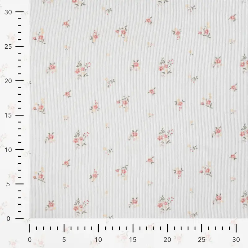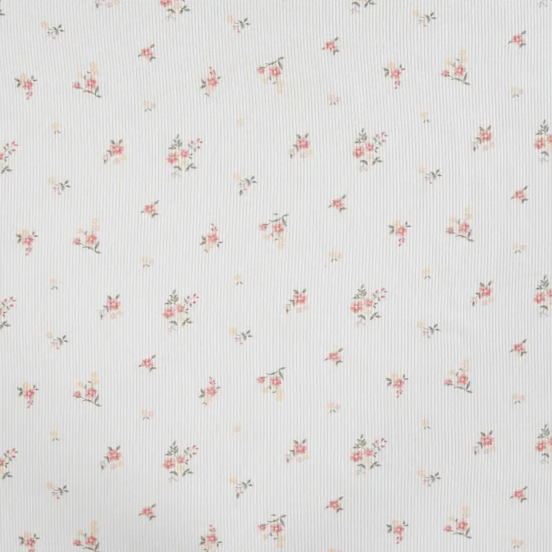 Der Rippenjersey „Floral Cream“ ist ein weicher, elastischer Feinstrickstoff mit feiner Rippstruktur und einem zarten, romantischen Blumenprint in Rosa, Gelb und Grün. Der cremige Grundton wirkt warm, natürlich und passt perfekt zu modernen wie klassischen Nähprojekten.