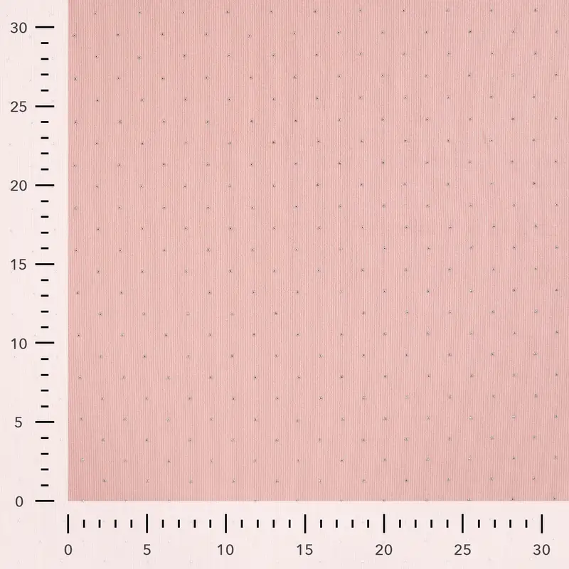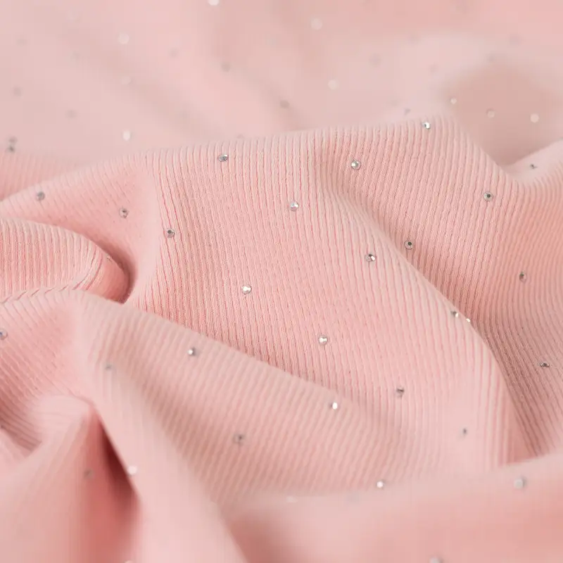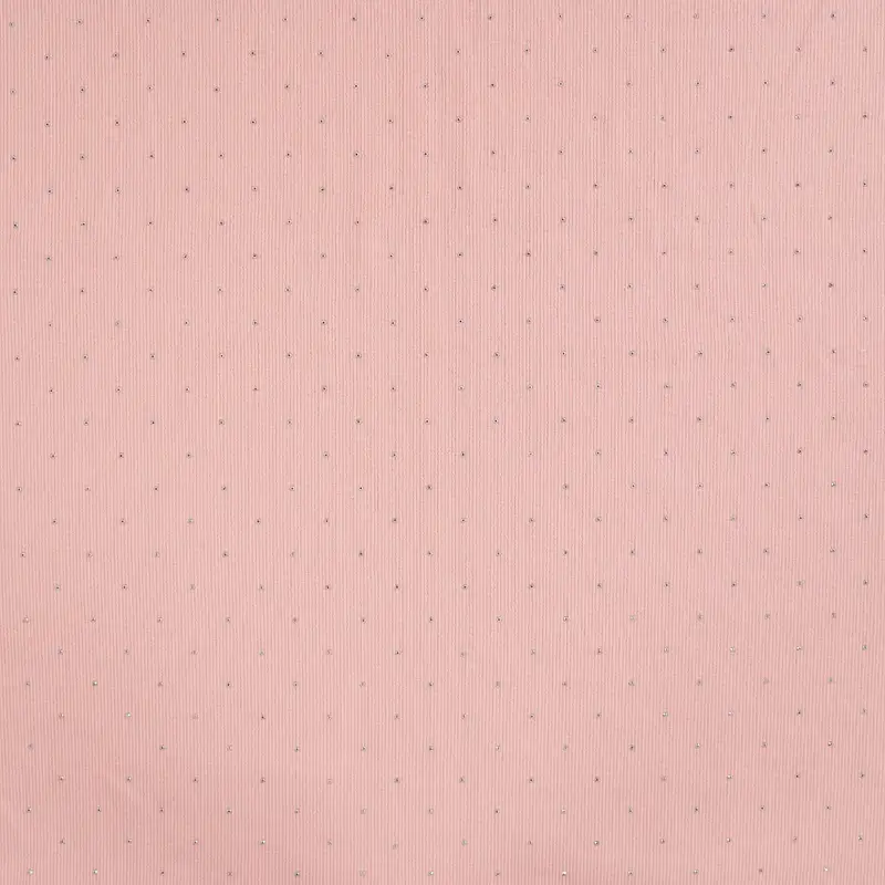 Der Rippjersey „Sparkle Rose“ ist ein echter Blickfang: weiches, feines Rippenmuster in zartem Rosé, veredelt mit kleinen Glitzersteinen, die bei jeder Bewegung dezent funkeln. Dieser Stoff wirkt edel, modern und trotzdem angenehm zurückhaltend – ideal für all die Projekte, die ein kleines bisschen Glamour vertragen dürfen.
