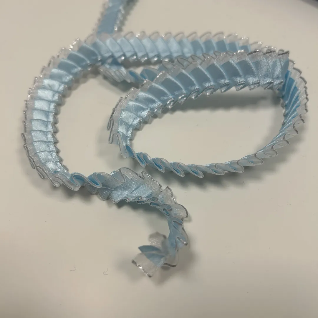 Die Rüschenborte „Ice Crystal“ vereint zartes Himmelblau mit einem feinen silbrigen Rand – wie gefrorene Tautropfen im Winterlicht. Die leicht gefaltete Satinstruktur wirkt edel, frisch und bringt eine elegante Bewegung in jedes Nähprojekt.