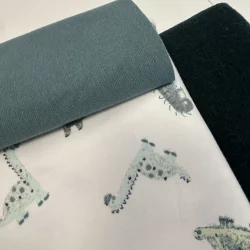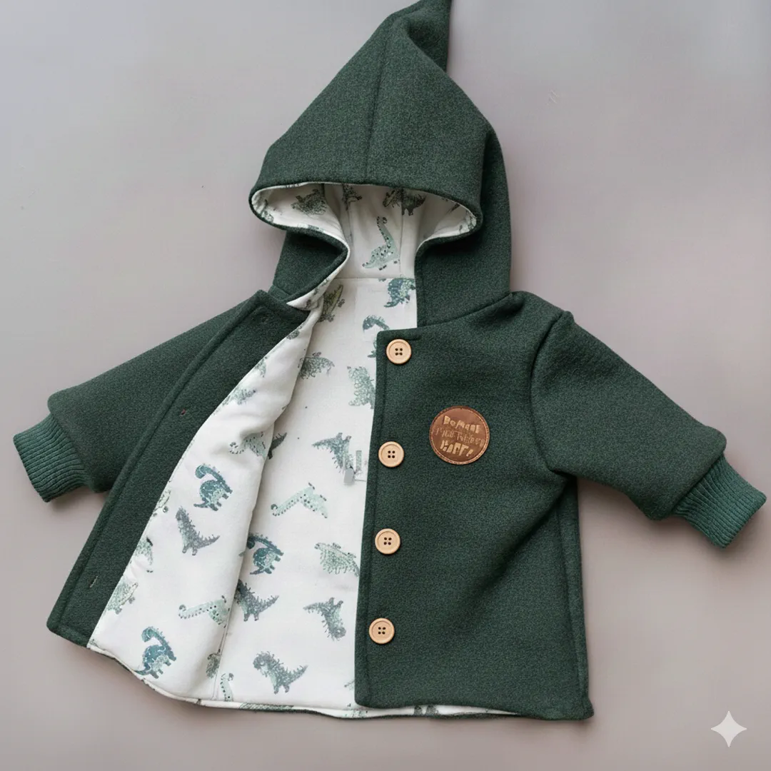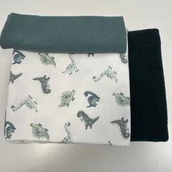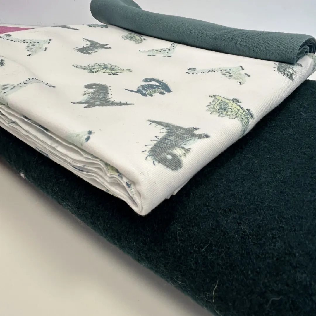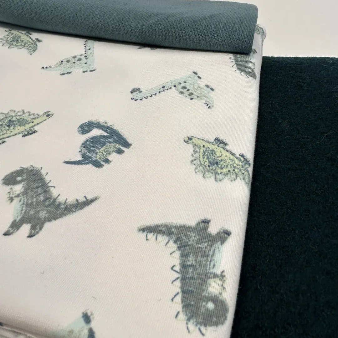Der hochwertige Wollwalk in tiefem Dunkelgrün hält wunderbar warm, ohne zu beschweren. Der Baumwolljersey mit Dino-Motiven sorgt für den verspielten Look und ist angenehm weich auf der Haut – perfekt für Ärmel, Innenkapuzen oder komplette Shirts.