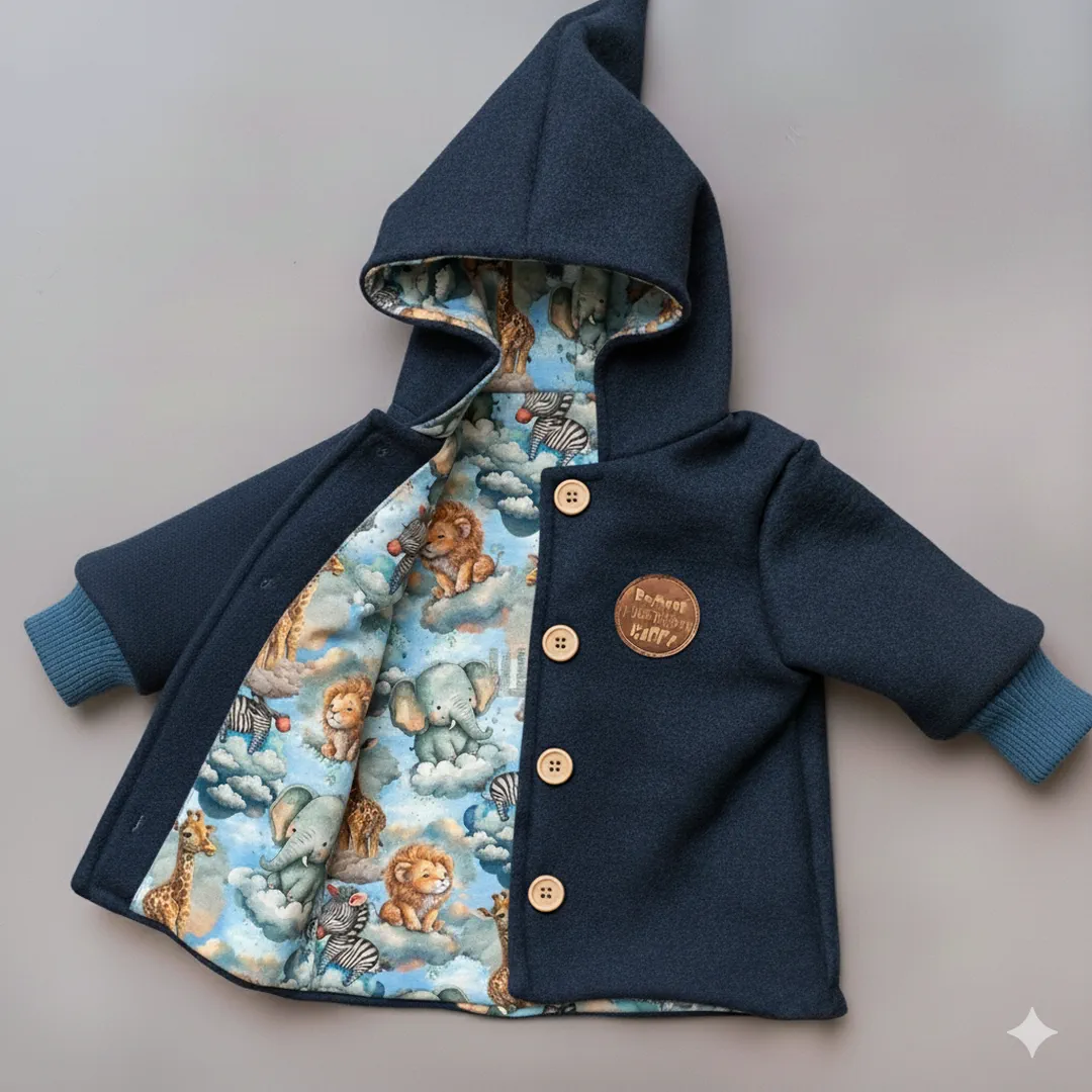 Dieses süße Stoffpaket bringt dir kleine Safari-Freunde direkt aufs Nähtischchen. Weicher Baumwolljersey mit Elefant, Löwe, Zebra & Giraffe trifft auf hochwertigen Wollwalk in dunkel Jeans – warm, robust und perfekt für Herbst & Winter.