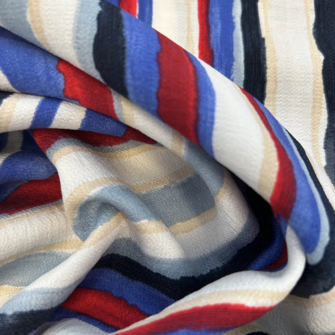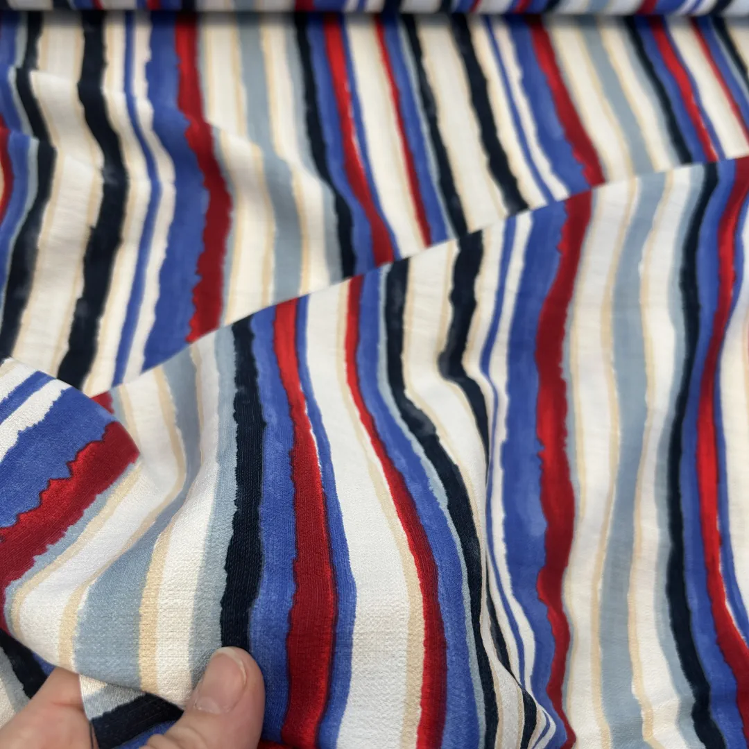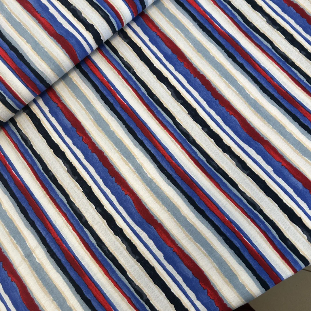 Das lebendige Streifendesign in Navy, Blau, Rot, Beige und Weiß wirkt wie mit Wasserfarbe gemalt und verleiht jedem Nähprojekt eine moderne, sommerliche Ausstrahlung. Durch die Air-Flow Struktur entsteht ein leicht gekreppter Effekt, der dem Stoff Tiefe gibt und ihn besonders angenehm zu tragen macht.